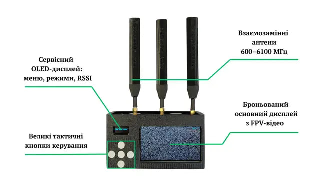 VIDAR-3 - портативний тридіапазонний відеодетектор БПЛА, який сканує аналогові FPV-сигнали в діапазонах 1.2, 3.3 та 5.8 ГГц і показує те саме відео, що бачить оператор дрона. VIDAR-3 створений з урахуванням реального бойового досвіду та зауважень військових. Саме тому він отримав броньоване скло, яке захищає головний дисплей від уламків, великі тактильні кнопки для роботи в тактичних рукавичках, продумані взаємозамінні антени для впевненого прийому та індикацію рівня сигналу (RSSI), щоб боєць бачив не тільки картинку, а й силу FPV-загрози.